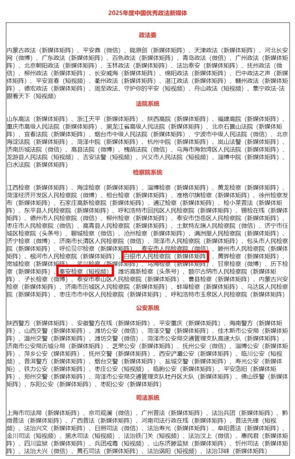 近日,中国信息化研究与促进网发布2025年中国优秀“互联网+政法服务”平台综合影响力评估报告,其中,白银市人民检察院(新媒体矩阵)、秦安检察(短视频)获评“2025年度中国优秀政法新媒体”。