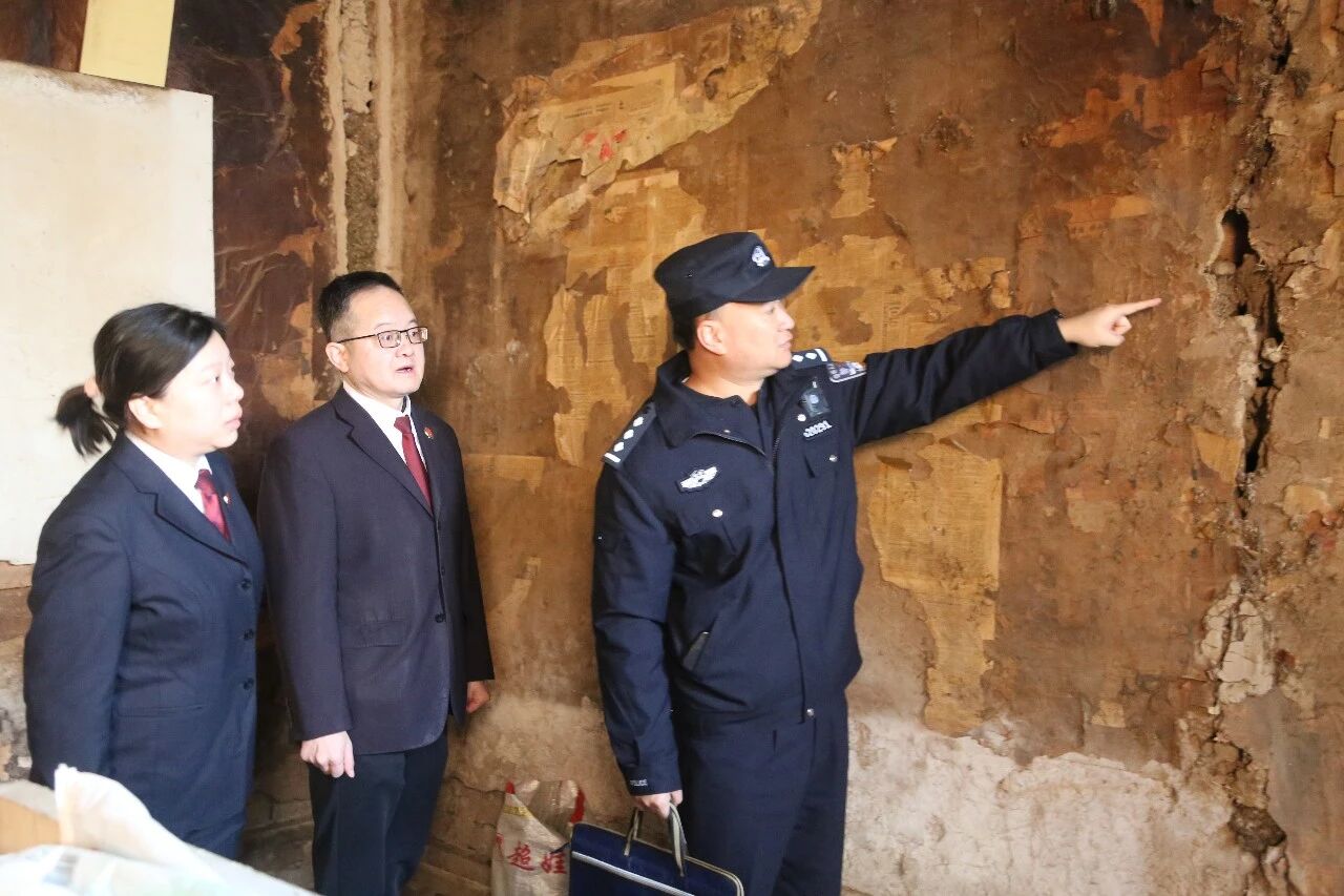 1月7日,清水县检察院司法警察协助办案检察官对县级文物保护单位靳氏古民居墙体开裂情况进行现场取证。