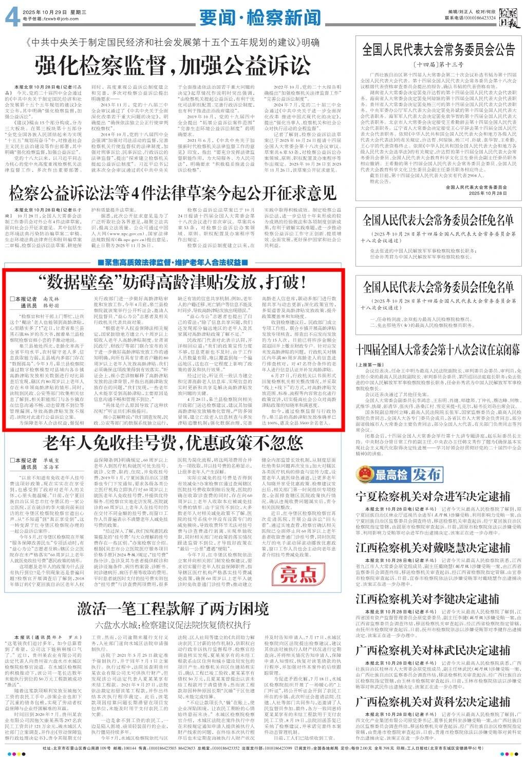 2025年10月29日,检察日报刊发《“数据壁垒”妨碍高龄津贴发放,打破!》。