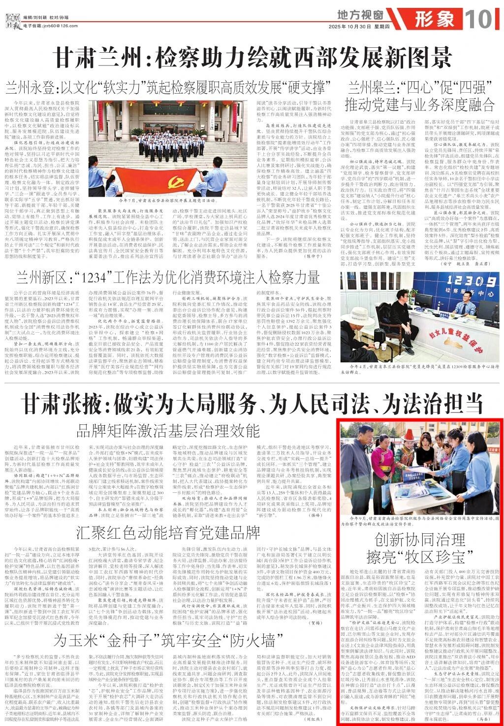 2025年10月30日,检察日报地方视窗《甘肃张掖:做实为大局服务、为人民司法、为法治担当》专版刊发《创新协同治理 擦亮“牧区珍宝”》。