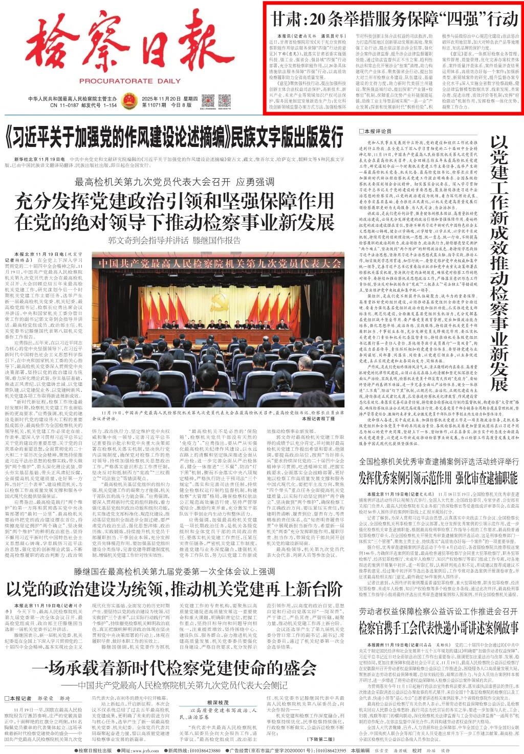 2025年11月20日,检察日报头版刊发《甘肃:20条举措服务保障“四强”行动》。