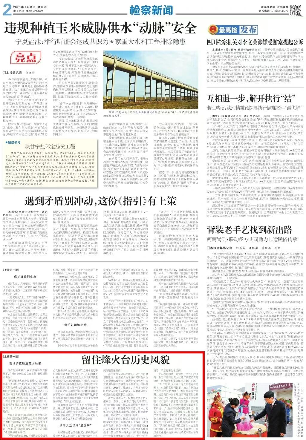 2026年1月8日,检察日报头版头条刊发《留住烽火台历史风貌 甘肃兰州:坚持“三个善于”化解长城遗址保护难题》。